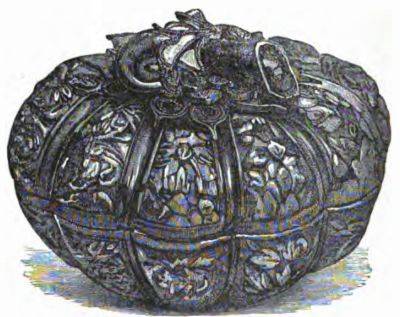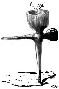 "It consists of a bucket of water, and the half of a cocoa-nut shell. There is a tiny hole like the prick of a needle in the bottom of the shell, and when you put it on the water you can just see a stream like a thread spurting up. It takes an hour to fill the shell, and when it is full it goes plump to the bottom of the bucket, making a bubbling noise that attracts[Pg 438] the attention of the man on duty, who immediately puts the shell in place again. I used to try it with my watch, and found that it never varied more than a minute from the hour, which is quite accurate enough for an Oriental. The motion of the boat had no effect on it, as the water in the bucket was always on a level.