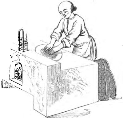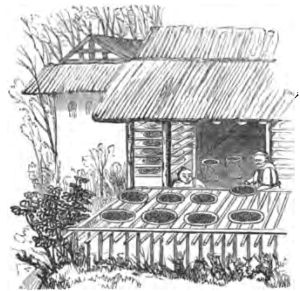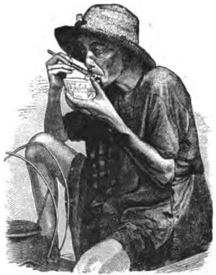 "The dry powder is then washed, and strained through a coarse sieve;[Pg 442] the water flows into a deep trough with a depression in the centre, where the sago sinks to the bottom and is secured. It is then pressed into cylinders weighing about thirty pounds each, or it is baked into cakes in a clay oven, with a series of compartments an inch wide, and six inches long and deep. The cakes will keep a long while if they are dried in the sun after baking. I have eaten sago that was said to be ten years old, and found it perfectly good."