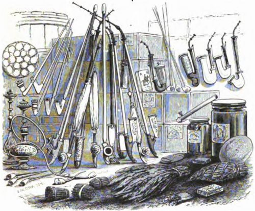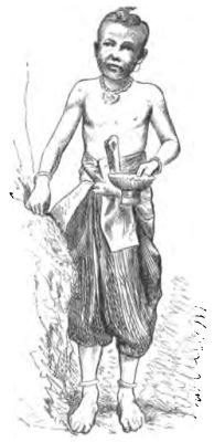 "The goods used in purchasing these articles are as varied as the purchasers. The most important item is that of arrack—a spirit distilled from rice, and resembling rum; about twenty thousand gallons of it are sold at Dobbo every year, and sometimes as many as twenty-five thousand. English[Pg 439] and American cottons are sold; and also tobacco, crockery, knives, muskets, gunpowder, Chinese gongs, small cannons, and elephants' tusks. The last three articles are the luxuries with which the natives of Aru buy their wives, and display in their houses or conceal as valuable property. They use tobacco both for chewing and smoking, and will not accept it unless it is very strong. The native pipe is similar to that used in Papua, or New Guinea, and is made of wood, with a long upright handle, which is set in the ground while the owner is using it. He squats before the pipe, and when in this position his mouth is just on a level with the end of the stem.