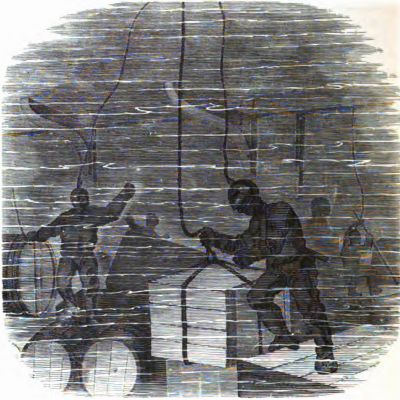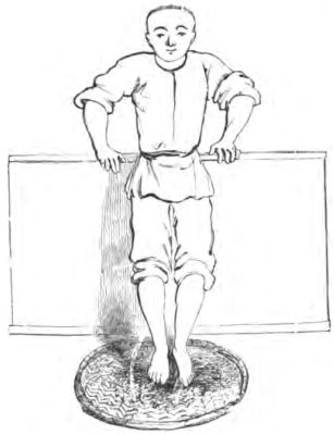 "There is an upright pole which is thrust through a bamboo basket; its top is fastened to a cross-bar, and the bottom is equipped with an iron ring in which boring-irons can be fitted. The barrel to be bored is set in the ground, the basket is filled with stones to give it weight, and two boys turn the cross-bar to make the boring-iron revolve. The barrel is bored in sections about eighteen inches long; and these are welded together, and afterwards bored to the required size.