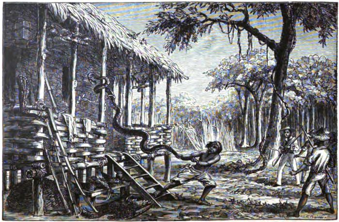 "I stayed with my friend a week, and found that he had a most delightful residence. He was fond of hunting, and was able to supply his table with meat by means of his gun and dogs. There were many wild pigs in the neighborhood, and he shot two of them while I was there, so that we had pork in abundance. Then there were several kinds of birds that were excellent eating. He had all the milk he wanted from his buffaloes, and made his own butter, raised his own rice and coffee, and smoked cigars from his own tobacco. He had ducks and chickens, and eggs in any desired quantity; his palm-trees supplied him with palm-wine and sugar, and he had nearly every tropical fruit that can be named. You see, by this account of his plantation, how well a man may live in one of the islands of the Archipelago, provided he can reconcile himself to the absence of society, and be contented with the sport that the hilly country affords.