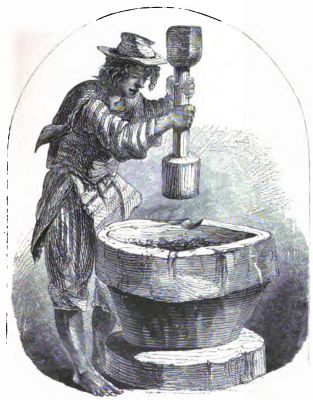 "When it is about fifteen years old the tree blossoms, and then dies. Just as it is about to blossom, it is cut down close to the ground, and stripped of its leaves. The upper part of the trunk is then taken off, so as to expose the pith of the tree, which is broken into a coarse powder by means of a club of heavy wood, having a piece of iron or sharp stone in one end. The whole inside of the tree is broken up till the trunk forms a trough not more than half an inch thick.