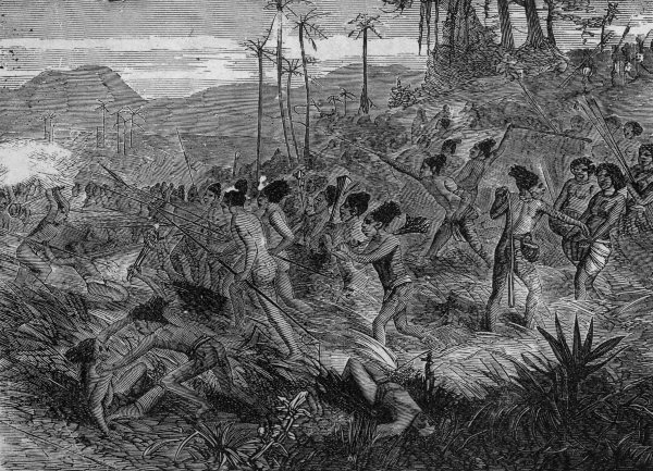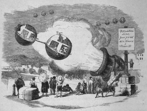 Such a situation is certainly a strong test of courage, which frequently quails in an entire state of placidity, when it would not blanch before the deadliest peril, could it be actively met. All we had to do—all, indeed, we could do—was to stand and take it. There was no possibility of shrinking or retreating, even had we been so inclined. We were precisely in the position of a regiment under a galling fire, and ordered not to move or return a single shot. Boom, bang, boom! whiz, yship, hursh! roar, crack, shriek!
