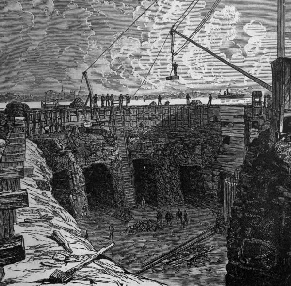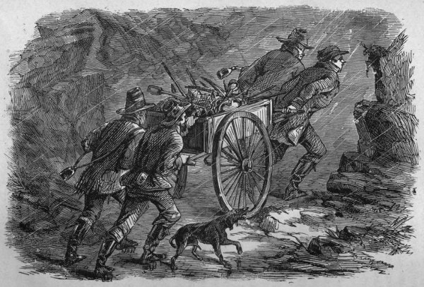 I have had so much experience in tunnels that I regard myself as an authority thereon. They are generally only large enough to admit the body of a good-sized man, who creeps into them, and, lying nearly flat, digs as hard as he can with any instrument he may procure. After the tunnel has been extended thirty or forty feet, lack of ventilation prevents the burning of lights, and anything like freedom of breathing. The Libby tunnel was some seventy feet long; and to remedy this defect, the officers made a large pair of bellows, much resembling those used by blacksmiths, with tacks, blankets, and boards. With this rude but ingenious instrument, they supplied with oxygen the two men employed in the tunnel, one in advance digging, and the other behind, carrying out, or rather backing out, with the dirt in a haversack. Progress, under such adverse circumstances, is necessarily slow, the digging generally being done with a pocket or case knife. Sometimes not more than two feet is made by twelve hours of hard labor, and no one works more than an hour at a time, as the foul air is very exhausting.