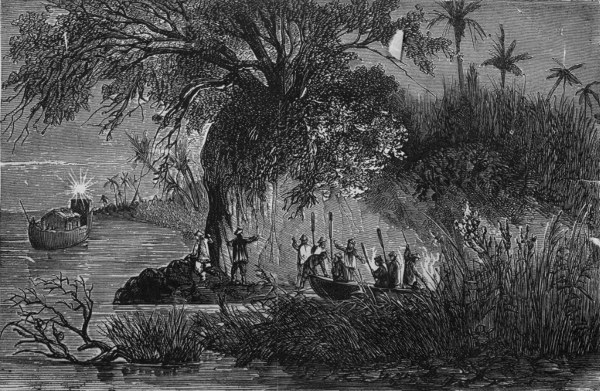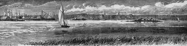 We had scarcely reached the bend of the Mississippi, when we saw a flash from the hostile guns, heard the boom, and felt that the outer barge was struck. We thought that to be hit by the first shot was pretty good to begin with. Knowing, too, that we should be nearly three quarters of an hour under fire,—most of the time immediately in front of the batteries,—our prospects of a happy issue to our expedition were far from brilliant. There being no further use in attempting to steal on the foe, the engineer of the tug set the engine in motion. Our progress, hampered by the huge barges, was necessarily slow—very little greater than that of the current.