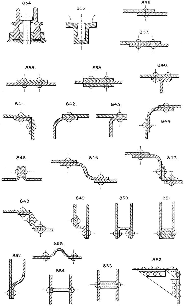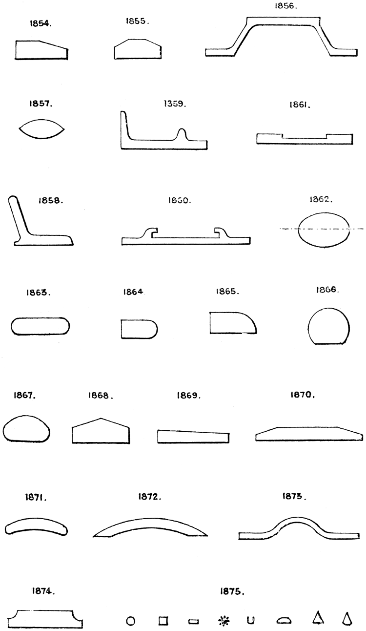 As a sample of the usual limiting sizes of iron plates, I give the following:—It consists of a few selected Snedshill plates rolled by the Lilleshall Company, one of the most favourably known Shropshire houses. They roll iron sheets and boiler plates from 1⁄16″ to 1″ in thickness, advancing by thirty-seconds to 3⁄16″, and by sixteenths to 1″.