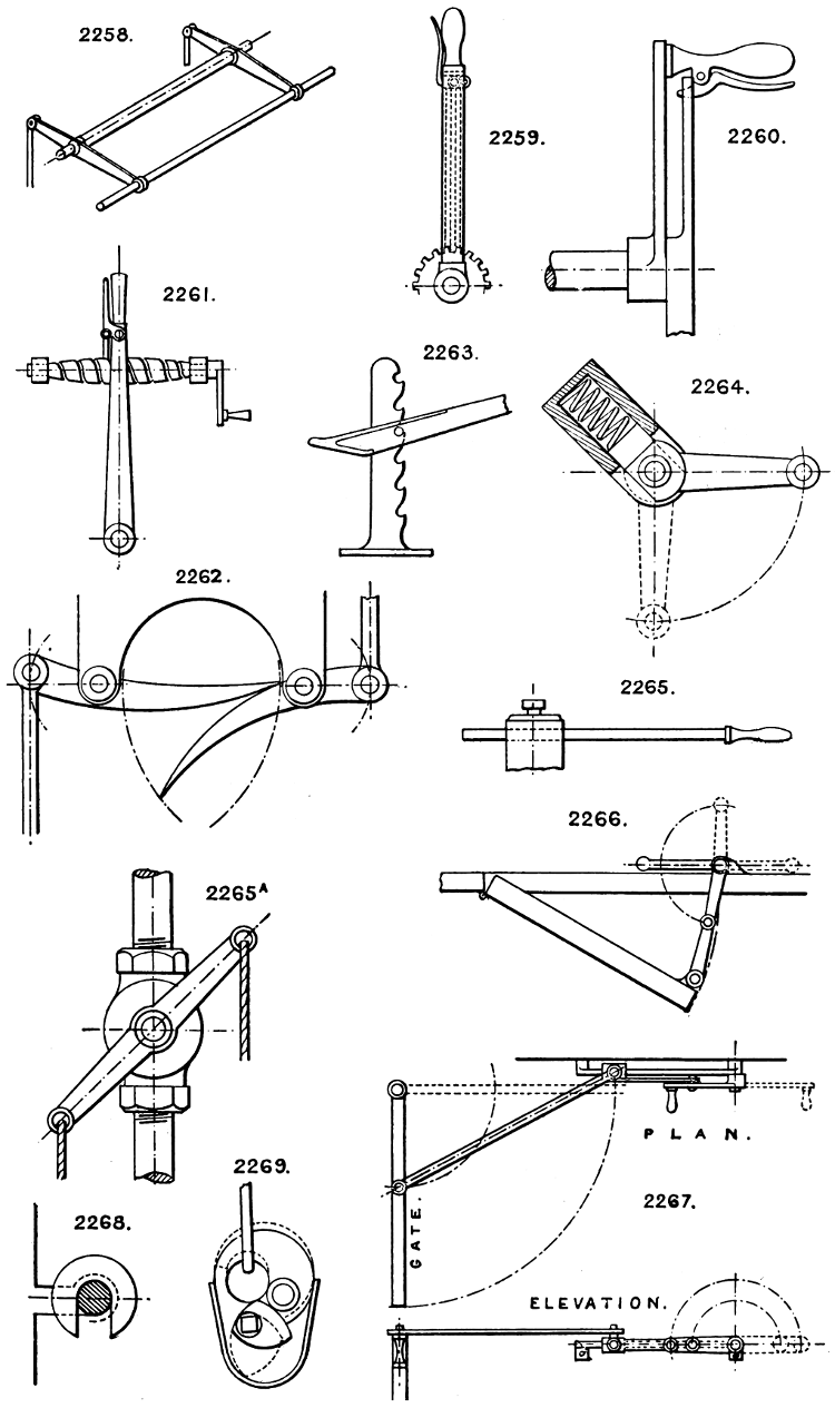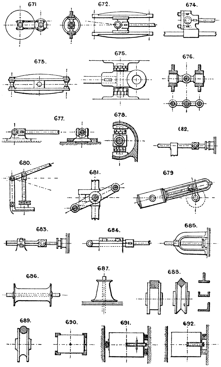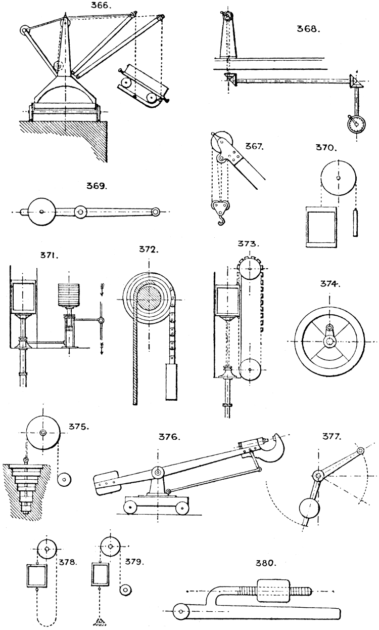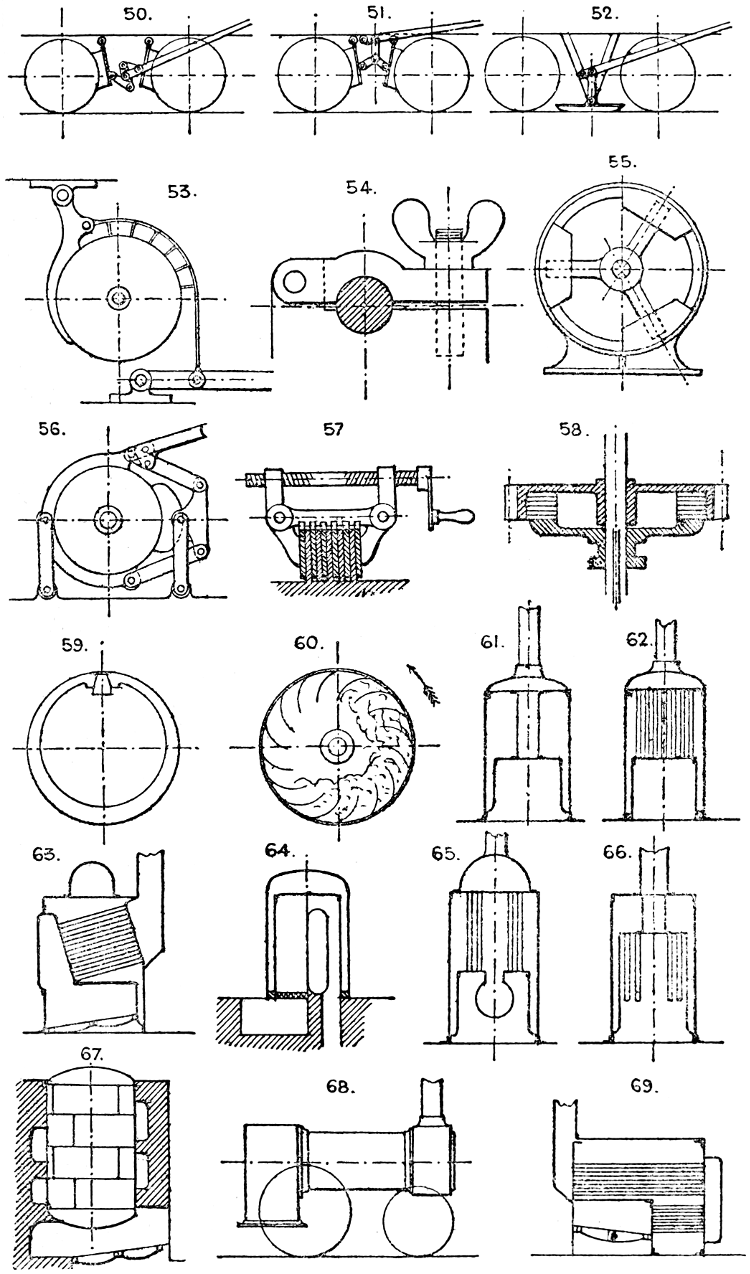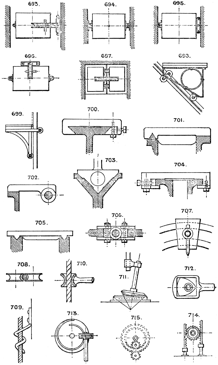 In the course of twenty-five years of such experience, I have found the want of such a volume as the present, and endeavoured to supply the deficiency in my own practice by private notes and sketches, gathered promiscuously, until the difficulty of selection and arrangement became so apparent that I began to classify them, as they exist in the following pages. A few weeks of unusual leisure have enabled me to complete this work and amplify it by numerous additions, and it is now presented in the hope that it will be found of equal service to others engaged in the head-splitting, exhausting work of scheming and devising machinery, than which I can conceive of no head-work more wearing and anxious, Several valuable works have already[vi] found numerous users, and there is no lack of admirable collections of memoranda, rules, and data for designing and proportioning the various constructive details of machinery; but, as far as I am aware, there is no work in existence which aims at the same purpose as is attempted in the following pages, viz. to provide side by side suggestive sketches of the various methods in use for accomplishing any particular mechanical movement or work, in a form easily referred to, and devoid of needless detail and elaboration. A sketch, properly executed, is—to a practical man—worth a folio of description; and it is to such that these pages are addressed. For the same reason it has been deemed undesirable to add to the various sketches any rules or tables relating to strengths or dimensions, which may be found in numerous well-known volumes.