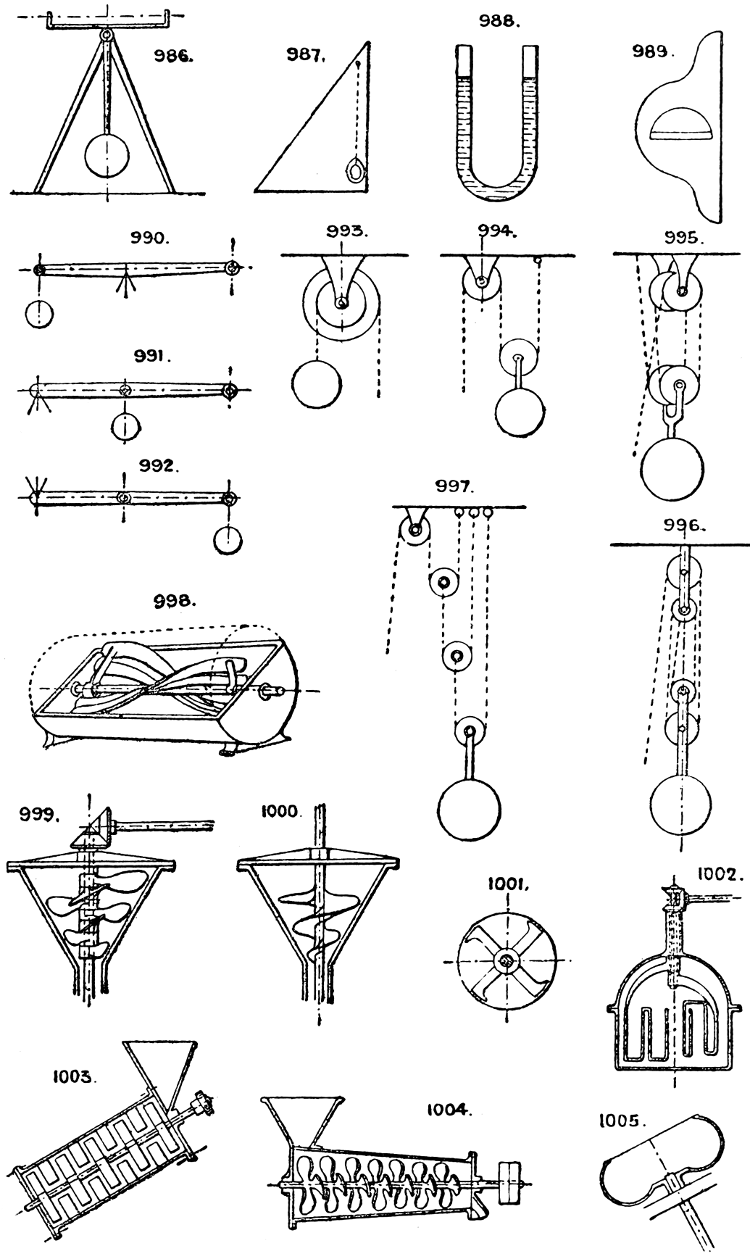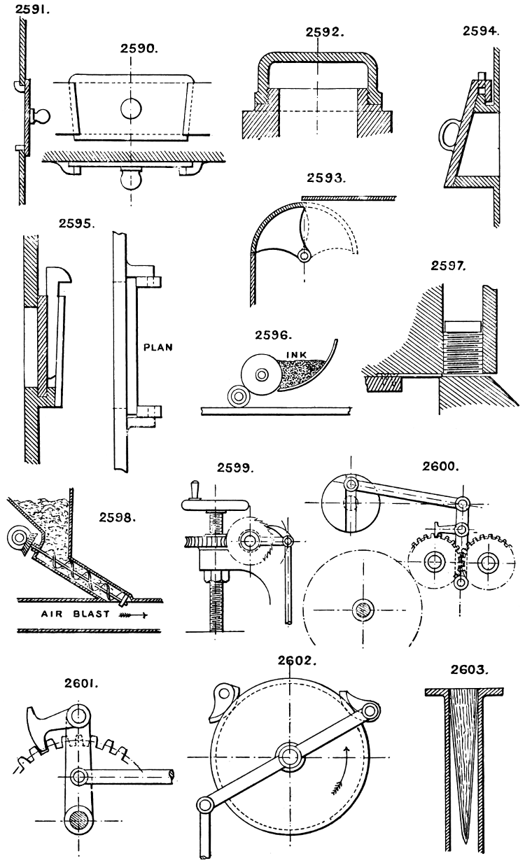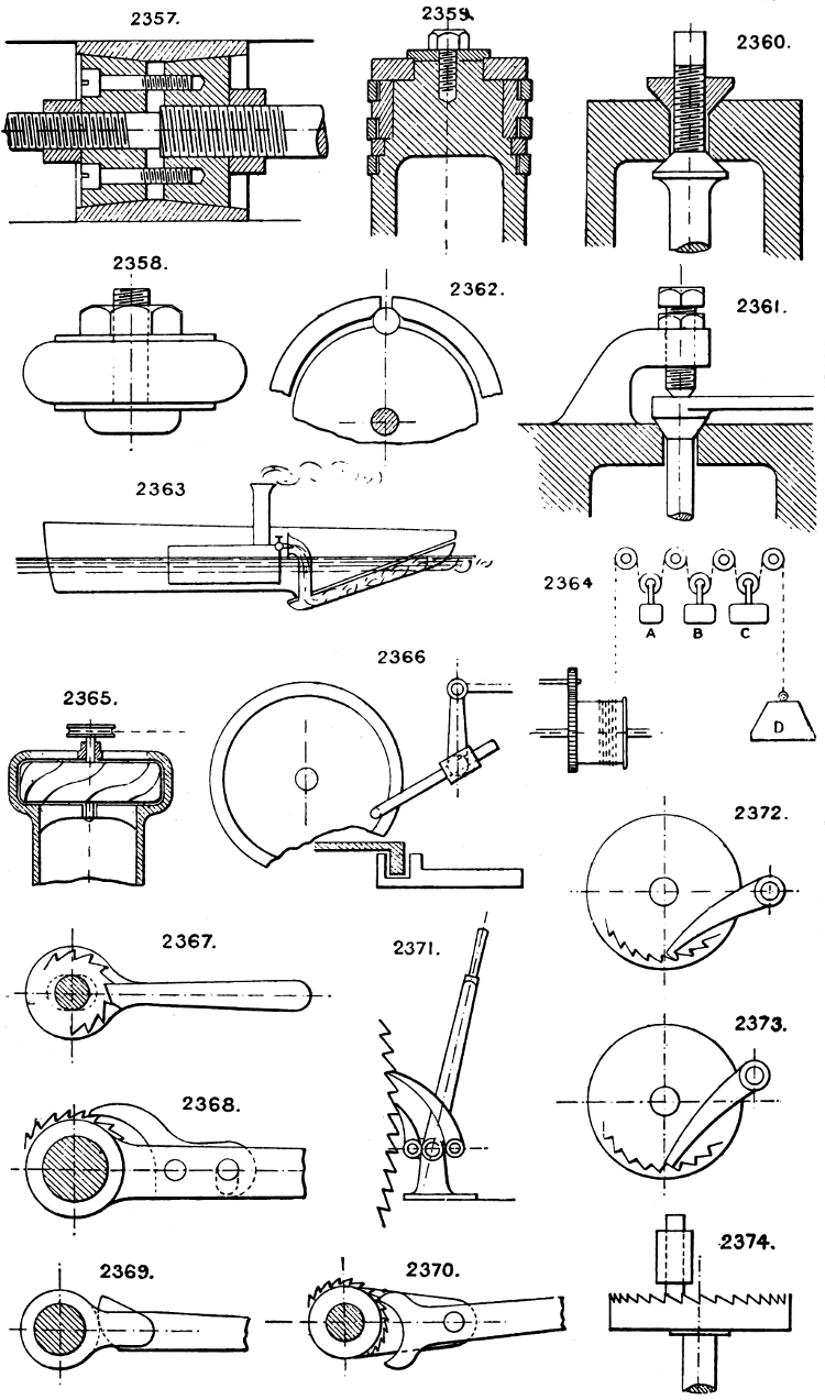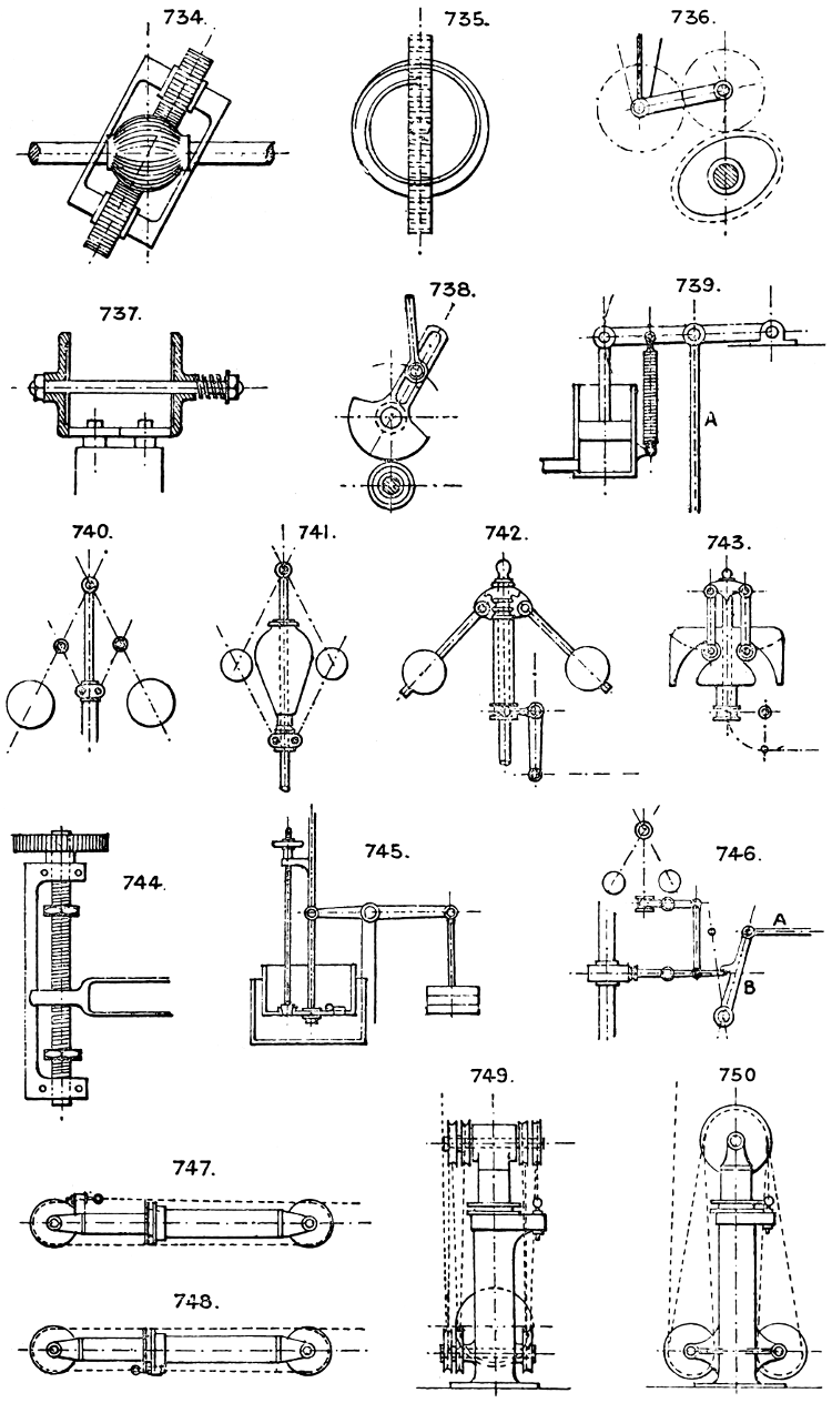 In the course of twenty-five years of such experience, I have found the want of such a volume as the present, and endeavoured to supply the deficiency in my own practice by private notes and sketches, gathered promiscuously, until the difficulty of selection and arrangement became so apparent that I began to classify them, as they exist in the following pages. A few weeks of unusual leisure have enabled me to complete this work and amplify it by numerous additions, and it is now presented in the hope that it will be found of equal service to others engaged in the head-splitting, exhausting work of scheming and devising machinery, than which I can conceive of no head-work more wearing and anxious, Several valuable works have already[vi] found numerous users, and there is no lack of admirable collections of memoranda, rules, and data for designing and proportioning the various constructive details of machinery; but, as far as I am aware, there is no work in existence which aims at the same purpose as is attempted in the following pages, viz. to provide side by side suggestive sketches of the various methods in use for accomplishing any particular mechanical movement or work, in a form easily referred to, and devoid of needless detail and elaboration. A sketch, properly executed, is—to a practical man—worth a folio of description; and it is to such that these pages are addressed. For the same reason it has been deemed undesirable to add to the various sketches any rules or tables relating to strengths or dimensions, which may be found in numerous well-known volumes.