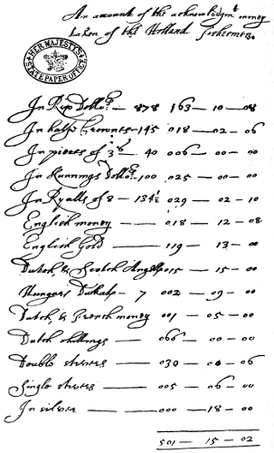 | Extravagant pretensions to the sovereignty of the sea—The ship-money writs and the old records—Charles proposes a great fishery society to compete with the Dutch—Coke prepares a scheme—Difficulties xiv with Scottish burghs—Charles requests Scottish Privy Council to further the scheme—Strenuous opposition in Scotland—Claim of “reserved waters” advanced—Commissioners on behalf of England and Scotland appointed—Prolonged negotiations—Extent of reserved waters defined—Modifications proposed—Burghs petition Charles to prevent the Hollanders from fishing in Scottish waters—Fisheries declared to be under the royal prerogative—Charles attends the conferences of the commissioners—Scheme finally agreed to—The “Royal Fishery of Great Britain and Ireland” established—Operations at the Lewes—Misfortunes and eventual failure of the society | 209 |