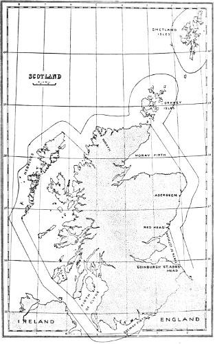 1346 According to an interesting table on a chart appended to the Annual Report of the Board of Agriculture and Fisheries for 1906 (see fig. 28), the areas, in square miles, between the three-mile limit and the 200-metre line, are as follows: North Sea, 152,473; North of Scotland (Orkney and Shetland), 18,096; West of Scotland, 32,099; West of Ireland, 9066; Irish Sea, 15,743; Southwards of Ireland, 50,416; Bristol Channel, 8613; English Channel, 25,238. The area at Iceland is 36,608, and at the Faröes, 4949 square miles.