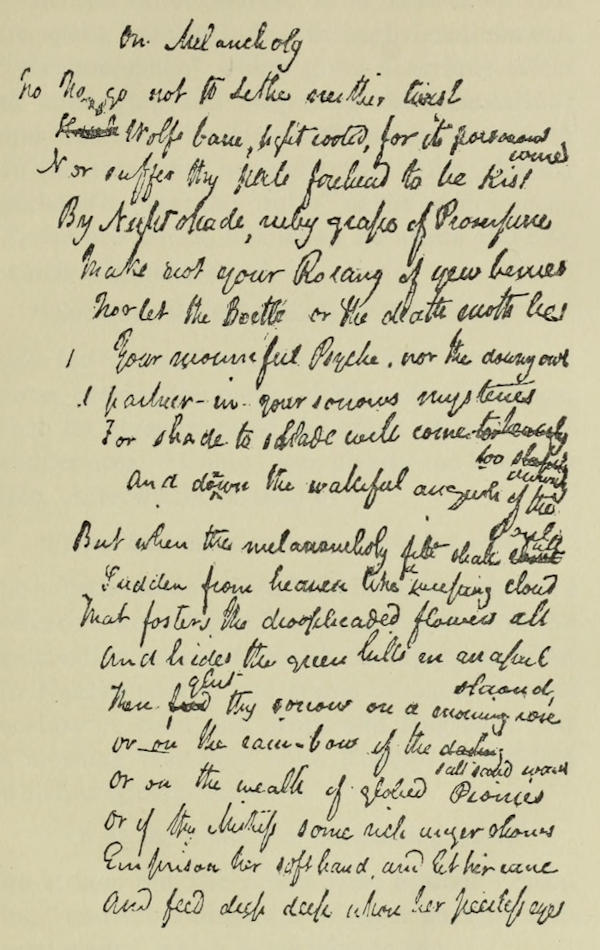 To begin with, the title varies slightly from that first adopted, and reads simply “On Melancholy,” to which the word “Ode” was later prefixed[26] by the printers. In the second line, where he had half written “Henbane” for the material of his incantation, he blots it out and puts “Wolfsbane,” instantly abandoning the tamer suggestion and bringing in all the wildness and the superstition that have gathered for years around the Loup-garou and the Wehr-wolf. This is plainly no amendment suggested afterward by another person, but is due unmistakably to the quick action of his own mind. There is no other change until the end of the first stanza, where the last two lines were originally written thus:—