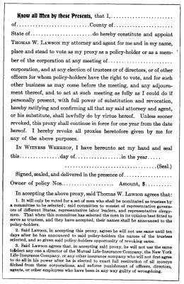 Dear Sirs: I have followed Mr. Lawson's article very closely and, as I understand it, he intimates that he has a remedy for the rotten condition of affairs now prevailing. What I, and many more of your readers, would like to know is, whether Mr. Lawson, in offering a remedy, is taking into consideration the 22,000,000 people of the country who neither invest in stocks nor hold any amount of insurance, or is his remedy meant merely to protect the four million small capitalists from being eaten up by what he terms the "System."