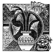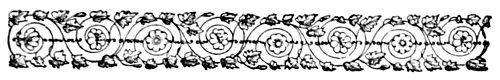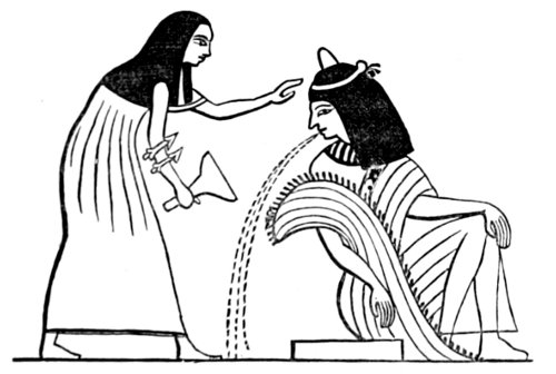 Although we might, perhaps, find in different countries examples of these principles in different states of development, we cannot in any one country trace the entire course of the development itself: for in all the highly civilised races of mankind, we first become acquainted with their history when they had already reached a considerable degree of refinement; and even at that period of their progress, our knowledge is almost confined to their religious, and to their more severely historical, monuments. Such is especially the case with Egypt, the history of which country, as represented by its monuments of art, carries us back to the remotest ages of antiquity. Egyptian art generally presents itself in a sombre and massive character, with little of gaiety or joviality in its designs or forms. Yet, as Sir Gardner Wilkinson has remarked in his valuable work on the “Manners and Customs of the Ancient Egyptians,” the early Egyptian artists cannot always conceal their natural tendency to the humorous, which creeps out in a variety of little incidents. Thus, in a series of grave historical pictures on one of the great monuments at Thebes, we find a representation of a wine party, where the company consists of both sexes, and which evidently shows that the ladies were not restricted in the use of the juice of the grape in their entertainments; and, as he adds, “the painters, in illustrating this fact, have sometimes sacrificed their gallantry to a love of caricature.” Among the females, evidently of rank, represented in this scene, “some call the servants to support them as they sit, others with difficulty prevent themselves from falling on those behind them, and the faded flower, which is ready to drop from their heated hands, is intended to be characteristic of their own sensations.” One group, a lady whose excess has been carried too far, and her servant who comes to her assistance, is represented in our cut No. 1. Sir Gardner observes that “many similar instances of a talent for caricature are observable in the compositions of the Egyptian artists, who executed the paintings of the tombs” at Thebes, which belong to a very early period of the Egyptian annals. Nor is the application of this talent restricted always to secular subjects, but we see it at times intruding into the most sacred mysteries of their religion. I give as a curious example, taken from one of Sir Gardner Wilkinson’s engravings, a scene in the representation of a funeral procession crossing the Lake of the Dead (No. 2), that appears in one of these early paintings at Thebes, in which “the love of caricature common to the Egyptians is shown to have been indulged even in this serious subject; and the retrograde movement of the large boat, which has grounded and is pushed off the bank, striking the smaller one with its rudder, has overturned a large table loaded with cakes and other things, upon the rowers seated below, in spite of all the efforts of the prowman, and the earnest vociferations of the alarmed steersman.” The accident which thus overthrows and scatters the provisions intended for the funeral feast, and the confusion attendant upon it, form a ludicrous scene in the midst of a solemn picture, that would be worthy of the imagination of a Rowlandson.