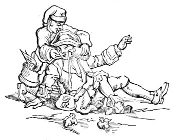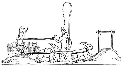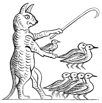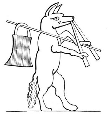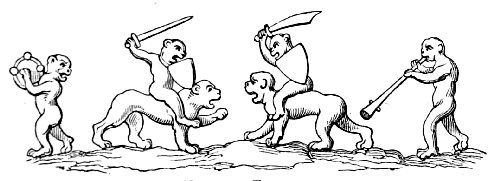 The practice having been once introduced of representing men under the character of animals, was soon developed into other applications of the same idea—such as that of figuring animals employed in the various occupations of mankind, and that of reversing the position of man and the inferior animals, and representing the latter as treating their human tyrant in the same manner as they are usually treated by him. The latter idea became a very favourite one at a later period, but the other is met with not unfrequently among the works of art which have been saved from the wrecks of antiquity. Among the treasures of the British Museum, there is a long Egyptian picture on papyrus, originally forming a roll, consisting of representations of this description, from which I give three curious examples. The first (see cut No. 4) represents a cat in charge of a drove of geese. It will be observed that the cat holds in her hand the same sort of rod, with a hook at the end, with which the monkeys are furnished in the preceding picture. The second (No. 5) represents a fox carrying a basket by means of a pole supported on his shoulder (a method of carrying burthens frequently represented on the monuments of ancient art), and playing on the well-known double flute, or pipe. The fox soon became a favourite personage in this class of caricatures, and we know what a prominent part he afterwards played in mediæval satire. Perhaps, however, the most popular of all animals in this class of drolleries was the monkey, which appears natural enough when we consider its singular aptitude to mimic the actions of man. The ancient naturalists tell us some curious, though not very credible, stories of the manner in which this characteristic of the monkey tribes was taken advantage of to entrap them, and Pliny (Hist. Nat. lib. viii. c. 80) quotes an older writer, who asserted that they had even been taught to play at draughts. Our third subject from the Egyptian papyrus of the British Museum (No. 6) represents a scene in which the game of draughts—or, more properly speaking, the game which the Romans called the ludus latrunculorum, and which is believed to have resembled our draughts—is played by two animals well known to modern heraldry, the lion and the unicorn. The lion has evidently gained the victory, and is fingering the money; and his bold air of swaggering superiority, as well as the look of surprise and disappointment of his vanquished opponent, are by no means ill pictured. This series of caricatures, though Egyptian, belongs to the Roman period.
