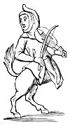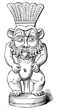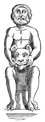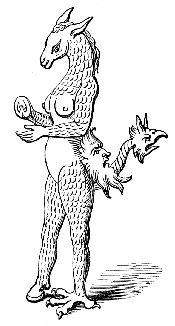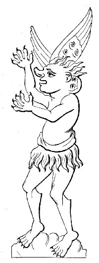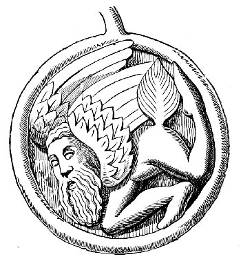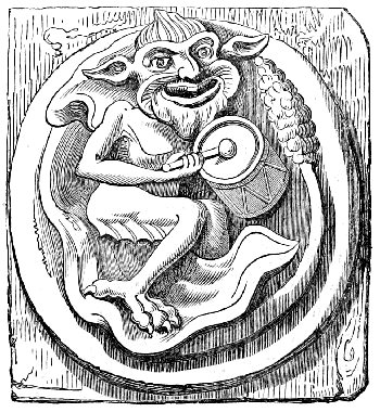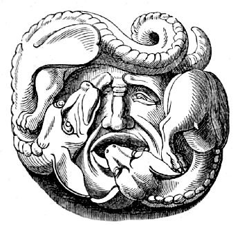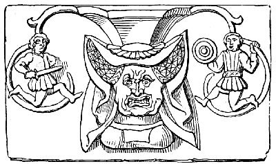 The monstrous is closely allied to the grotesque, and both come within the province of caricature, when we take this term in its widest sense. The Greeks, especially, were partial to representations of monsters, and monstrous forms are continually met with among their ornaments and works of art. The type of the Egyptian monster is represented in the accompanying cut (No. 7), taken from the work of Sir Gardner Wilkinson before quoted, and is said to be the figure of the god Typhon. It occurs frequently on Egyptian monuments, with some variation in its forms, but always characterised by the broad, coarse, and frightful face, and by the large tongue lolling out. It is interesting to us, because it is the apparent origin of a long series of faces, or masks, of this form and character, which are continually recurring in the grotesque ornamentation, not only of the Greeks and Romans, but of the middle ages. It appears to have been sometimes given by the Romans to the representations of people whom they hated or despised; and Pliny, in a curious passage of his “Natural History,”[1] informs us that at one time, among the pictures exhibited in the Forum at Rome, there was one in which a Gaul was represented, “thrusting out his tongue in a very unbecoming manner.” The Egyptian Typhons had their exact representations in ancient Greece in a figure of frequent occurrence, to which antiquaries have, I know not why, given the name of Gorgon. The example in our cut No. 8, is a figure in terra-cotta, now in the collection of the Royal Museum at Berlin.[2]
