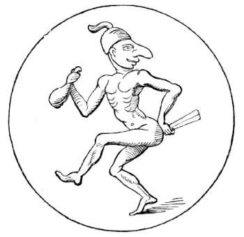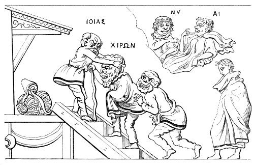 In Greece, however, the spirit of caricature and burlesque representation had assumed a more regular form than in other countries, for it was inherent in the spirit of Grecian society. Among the population of Greece, the worship of Dionysus, or Bacchus, had taken deep root from a very early period—earlier than we can trace back—and it formed the nucleus of the popular religion and superstitions, the cradle of poetry and the drama. The most popular celebrations of the people of Greece, were the Dionysiac festivals, and the phallic rites and processions which accompanied them, in which the chief actors assumed the disguise of satyrs and fawns, covering themselves with goat-skins, and disfiguring their faces by rubbing them over with the lees of wine. Thus, in the guise of noisy bacchanals, they displayed an unrestrained licentiousness of gesture and language, uttering indecent jests and abusive speeches, in which they spared nobody. This portion of the ceremony was the especial attribute of a part of the performers, who accompanied the procession in waggons, and acted something like dramatic performances, in which they uttered an abundance of loose extempore satire on those who passed or who accompanied the procession, a little in the style of the modern carnivals. It became thus the occasion for an unrestrained publication of coarse pasquinades. In the time of Pisistratus, these performances are assumed to have been reduced to a little more order by an individual named Thespis, who is said to have invented masks as a better disguise than dirty faces, and is looked upon as the father of the Grecian drama. There can be no doubt, indeed, that the drama arose out of these popular ceremonies, and it long bore the unmistakable marks of its origin. Even the name of tragedy has nothing tragic in its derivation, for it is formed from the Greek word tragos (τράγος), a goat, in the skins of which animal the satyrs clothed themselves, and hence the name was given also to those who personated the satyrs in the processions. A tragodus (τραγῳδὸς) was the singer, whose words accompanied the movements of a chorus of satyrs, and the term tragodia was applied to his performance. In the same manner, a comodus (κωμωδὸς) was one who accompanied similarly, with chants of an abusive or satirical character, a comus (κῶμος), or band of revellers, in the more riotous and licentious portion of the performances in the Bacchic festivals. The Greek drama always betrayed its origin by the circumstance that the performances took place annually, only at the yearly festivals in honour of Bacchus, of which in fact they constituted a part. Moreover, as the Greek drama became perfected, it still retained from its origin a triple division, into tragedy, comedy, and the satiric drama; and, being still performed at the Dionysiac festival in Athens, each dramatic author was expected to produce what was called a trilogy, that is, a tragedy, a satirical play, and a comedy. So completely was all this identified in the popular mind with the worship of Bacchus, that, long afterwards, when even a tragedy did not please the audience by its subject, the common form of disapproval was, τί ταῦτα πρὸς τὸν Διόνυσον—“What has this to do with Bacchus?” and, οὐδὲν πρὸς τὸν Διόνυσον—“This has nothing to do with Bacchus.”