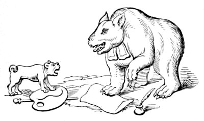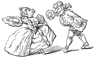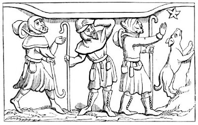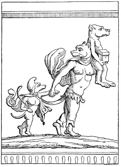 Another cut (No. 3), taken from one of the same series of paintings, belongs to a class of caricatures which dates from a very remote period. One of the most natural ideas among all people would be to compare men with the animals whose particular qualities they possessed. Thus, one might be as bold as a lion, another as faithful as a dog, or as cunning as a fox, or as swinish as a hog. The name of the animal would thus often be given as a nickname to the man, and in the sequel he would be represented pictorially under the form of the animal. It was partly out of this kind of caricature, no doubt, that the singular class of apologues which have been since distinguished by the name of fables arose. Connected with it was the belief in the metempsychosis, or transmission of the soul into the bodies of animals after death, which formed a part of several of the primitive religions. The earliest examples of this class of caricature of mankind are found on the Egyptian monuments, as in the instance just referred to, which represents “a soul condemned to return to earth under the form of a pig, having been weighed in the scales before Osiris and been found wanting. Being placed in a boat, and accompanied by two monkeys, it is dismissed the sacred precinct.” The latter animals, it may be remarked, as they are here represented, are the cynocephali, or dog-headed monkeys (the simia inuus), which were sacred animals among the Egyptians, and the peculiar characteristic of which—the dog-shaped head—is, as usual, exaggerated by the artist.