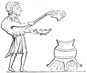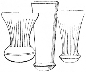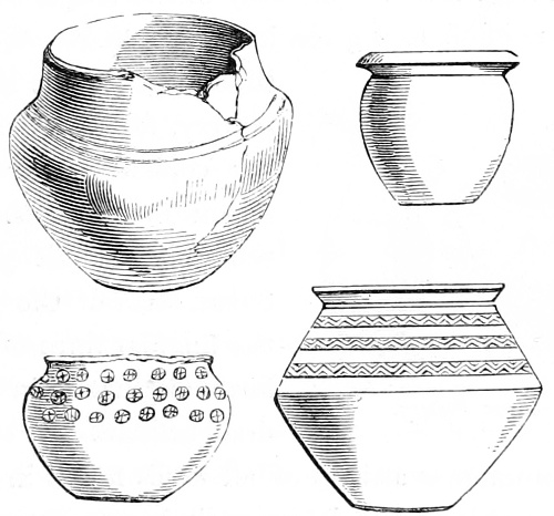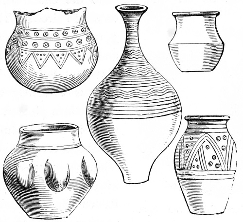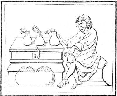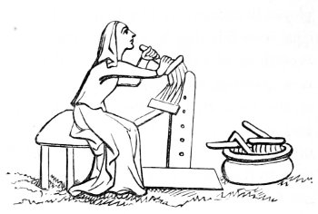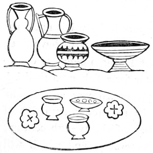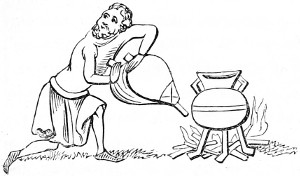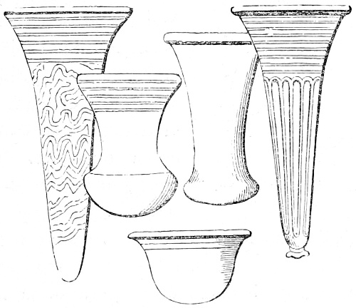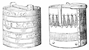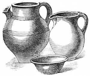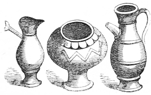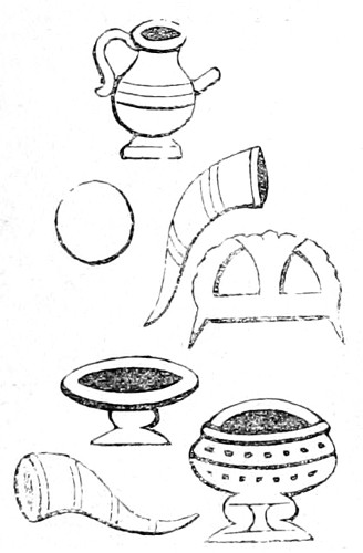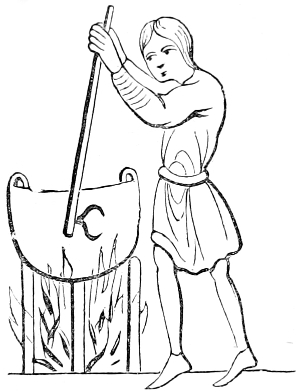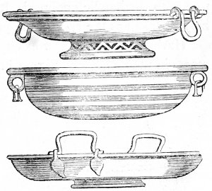 4 William of Malmesbury, de Gest. Pontif. printed in Gale, p. 249, describes the Saxons as cooking their meat in lebete, evidently meaning the sort of vessel figured in the foregoing cuts. The Latin lebes, a cauldron or kettle, is interpreted in the early glossaries by the Anglo-Saxon hwer, or huer, from which we derive the English word ewer; hwær-boll or hwær-cytel are interpreted in the Anglo-Saxon dictionaries as meaning a frying-pan, which is evidently not correct.