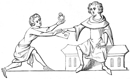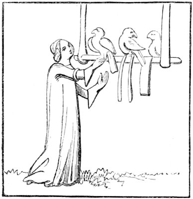 27 Item, que par la dicte dame Agnes vous faciez principalment et diligemment penser de vos bestes de chambre, comme petis chiennés, oiselets de chambre; et aussi la beguine et vous pensez des autres oiseauls domeschés, car ils ne pevent parler, et pour ce vous devez parler et penser pour eulx, se vous en avez.—(Ménagier de Paris, ii. 62.)