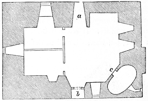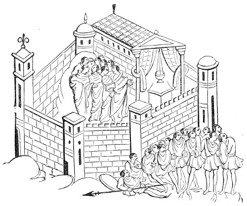 3 Strutt has engraved, without indicating the manuscript from which it is taken, a small Saxon house, consisting of one hall or place for living in, with a chamber attached, exactly like the domestic chapel and its attached chamber in our cut, No. 12. This seems to have been the usual shape of small houses in the Anglo-Saxon period.