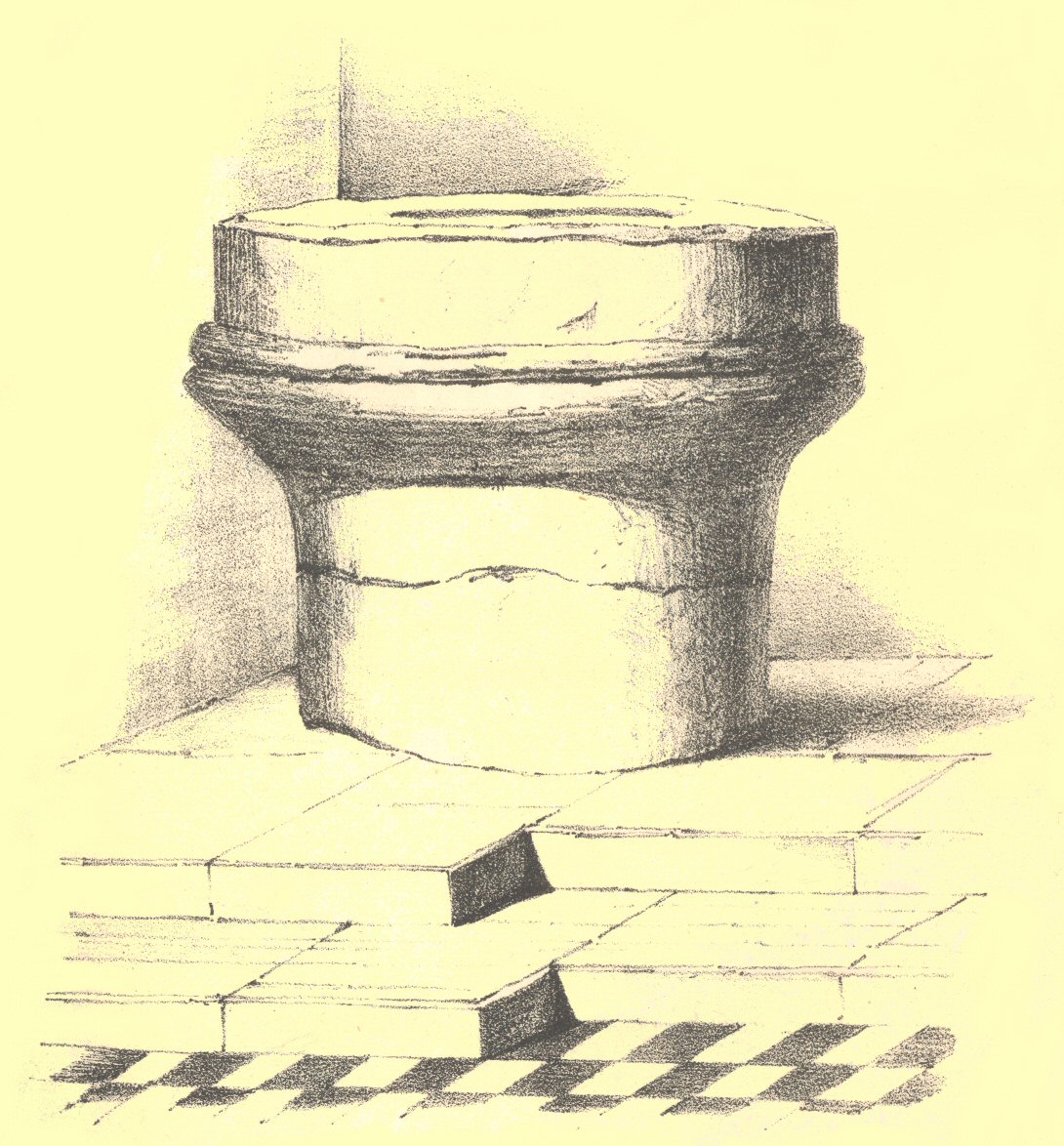 We will now return to the long alley, as we have ventured to call it, on the southern side of the building we have been describing. It has been already stated that there were found in this alley two steps, formed each of a large squared stone, attached to two doorways in the western continuation of the Old Wall. The more western of these two p. 38steps was very much worn by the feet of the people who had passed over it, as though it had led to some place of public resort. It was at the more easterly of these doorways that the excavations were carried to the southward of the Old Wall. This doorway apparently led into some open court which communicated with domestic apartments. A trench carried directly southward from the doorway, brought the excavators to the semicircular end of a hypocaust, which had warmed a considerable room thirty-seven feet long, by twenty-five feet wide, and which was in a state of very perfect preservation when opened, although the floor which once covered it had entirely disappeared. The pillars, which were formed of Roman square bricks, placed one upon another without mortar, and of which 120 were counted, were above three feet high. This room has now been completely laid open, and on the western side has a complicated arrangement of walls, which evidently served some purpose connected with the heating of the hypocausts. A considerable quantity of unburnt coal was found here. The northern end of this hypocaust, the wall of which remained to the height of several feet, presents an imposing mass of masonry, and we learn from it the interesting fact that the Roman houses were plastered and painted externally as well as internally. The exterior of the semicircular wall at the north end of this p. 39hypocaust was painted red, with stripes of yellow. Near it lay an immense stone, hewn into the shape to fit the semicircular wall of the hypocaust, which had evidently formed part of a massive band of such stones at some height in the wall. A strong piece of iron is soldered into it with lead, for the purpose of attaching something to the building externally. A little alley, considerably wider than the spaces between the pillars of bricks, ran across this hypocaust, and through an opening in the wall, into another hypocaust, which was entered from without by a large archway, and this again was approached by a flight of three steps, each step composed of one large well-squared stone, descending from a square platform, which was apparently on a level with the original floors of the rooms. When the steps were uncovered, a broken shaft of a large column was found lying across them. The platform at the bottom of the steps, or at least the corner of it farthest from the arched entrance to the hypocaust, seems to have been used by the last occupiers of this building as a receptacle for the dust swept from floors and passages, for the earth, for about a foot deep on the floor, was literally filled with coins, hair-pins, fibulæ, broken pottery and glass, bones of birds and animals which had been eaten, and a variety of other such objects.