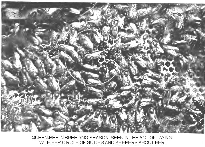 The story is variously rendered by ancient writers. Some say that bees already existed in the world, and that Amalthea was only a goat, whose milk served to nourish the baby-god, in addition to the honey that Melissa obtained from the wild bees in the cave where Jupiter lay hidden. Another account has it that the bees themselves were drawn to his place of concealment by the noise made by his nurses, who beat continually p. xon brazen pans to keep the sound of his infant lamentations from the ears of his ravening sire. Thenceforward the bees took over the charge of him, bringing him daily rations of honey until he grew up and was able to hold his own in the Olympian theogony. In either case Jupiter showed his gratitude towards his preservers in true celestial fashion. It was a very ancient belief among the earliest writers that, in the single instance of the honey-bee, the ordinary male-and-female principle was abrogated, and that the propagation of the species took place by miraculous means. In explanation of this, we are told it was a special gift from Jupiter in acknowledgment of the unique service rendered him. In one version of the fable, and in the words of a famous bee-master who wrote in 1657, “Jupiter, for so great a benefit, bestowed on his nurses for a reward that they should have young ones, and continue their kind, without wasting themselves in venery.” In the other, and probably much older form of the legend, Melissa, the beautiful Princess of Crete, was herself changed by the god into a bee, with the like immaculate propensities; and thenceforward the work of collecting honey for the food of man—that honey which, down to a very few centuries from the present time, was universally believed to p. xibe a miraculous secretion from heaven—was confided to her descendants.