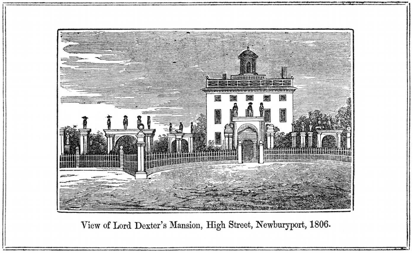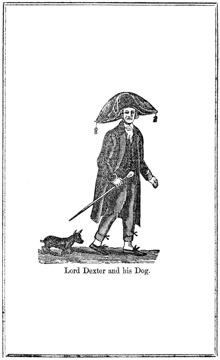 Timothy Dexter, the author of the following curious and unique production, entitled "A Pickle for the Knowing Ones," which is here re-printed verbatim et spellatim from the original edition, was born in Malden, January 22, 1747. Having served an apprenticeship with a leather dresser, he commenced business in Newburyport shortly after he was one and twenty, and being industrious and economical, he soon found himself in good circumstances. In the year 1770 he married, and receiving a considerable amount of money with his wife, he was thus put in possession of a moderate fortune. In 1776 he had for one of his apprentices the no less eccentric, and afterwards the no less noted Jonathan Plumer, jun., "travelling preacher, physician and poet," as he was accustomed to style himself, and of whom we shall hereafter speak. In addition to his regular business of selling leather breeches, gloves "soutabel for wimen's ware," &c. he engaged in commercial speculations, and in various kinds of business, and was unusually successful. He traded with merchants and speculators in the then Province of Maine, was engaged to some extent in the West India trade. He also purchased a large amount of what were called State securities, which were eventually redeemed at prices far exceeding their original cost. Some of his speculations in whalebone and warming pans are mentioned by himself on page 23 of this work. Thus in various ways he added to his property, and in a few years he became a wealthy man. With wealth came the desire of distinction, and as his vanity was inordinate he spared no expence in obtaining the notoriety he sought. In the first place he purchased an elegant house in High Street, Newburyport, and embellished it in his peculiar way. Minarets surmounted with golden balls were placed on the roof, a large gilt eagle was placed on the top, and a great variety of other ornaments. In front of his house and land he caused to be erected between forty and fifty wooden statues, full length and larger than life. The principal arch stood directly in front of his door, and on this stood the figures of Washington, Adams and Jefferson. There were also the statues of William Pitt, Franklin, Bonaparte, George IV, Lord Nelson, Gen. Morgan, Cornplanter, an Indian Chief, Jack Tar, Traveling Preacher, Maternal Affection, Two Grenadiers, Four Lions and one Lamb, and conspicuous among them were two images of Dexter himself, one of which held a label with the inscription "I am the first in the East, the first in the West, and the greatest philosopher in the Western world." In order that the interior of his house should correspond with the exterior, the most costly furniture was imported from France, and the walls hung with paintings, brought from Holland and other parts of Europe. A library was also provided, but how large or valuable we are not able to say. An elegant coach with a span of beautiful cream colored horses was procured, on which was painted his coat of arms, with the baronial supporters, after the manner of the English nobility. With this equipage he took the title of Lord Dexter, because, as he said, it was "the voice of the people at Large." He was sometimes called the Marquis of Newburyport. Having completed the embelishments of his house and gardens, Lord Dexter busied himself in receiving the visits of the crowds, who were drawn by curiosity to his house. His gardens were thrown open to their inspection, and he was liberal to all. The fame of his hospitality attracted as many visitors as the fame of his images. To gratify his vanity he selected in imitation of European princes, a poet laureate. This was no other than his former apprentice, Jonathan Plumer, jun., a native of Newbury. [4] They had once been associated as master and apprentice, but now stood in the relation of patron and poet. From the auto-biography of Plumer a very curious and scarce production of 244 pages, the following extract is taken, which may serve to give some idea of the versatility of his genius.—"I had," says he, "some practice as a physician, and earned something with my pen, but for several years was obliged chiefly to follow various kinds of business accounted less honorable, viz: Farming, repeating select passages from authors, selling halibut, sawing wood, selling books and ballads in the streets, serving as post boy, filling beds with straw and wheeling them to the owners thereof, collecting rags, &c." He had previously served one or two campaigns as a soldier, and on his return from the wars he taught school for some time in New Hampshire. The ballads, which he hawked about, were generally his own composition. Every horrid accident, bloody murder, a shipwreck, or any other dreadful catastrophe, was sure to be followed by a statement of the facts, a sermon and a poem. In the capacity of ballad maker and monger he attracted the notice of Dexter, in whose service he entered for a small salary as poet laureate. He wore a livery, consisting of a black frock coat, adorned with stars and fringes, a cocked hat and black breeches. He was crowned in the garden of his patron with a wreath of parsley, instead of laurel, but the ceremony was interrupted before its completion by a mob of boys, and both patron and poet put to flight. One specimen of his laudatory verses may be seen on page 29 of this work, which will give the reader some idea of his qualifications for the office to which he was elected. How well he was satisfied with the praises of the poet we are not informed, but feeling probably that no person but himself could do justice to the ideas, which he wished to present to the public, he commenced writing for the press. Several of these effusions were printed in the newspapers.—The larger part of them written at different times are embodied in the present work, a large edition of which was published by himself and given away. In this edition not a stop or a mark was used in any line of his writings, but in the second
