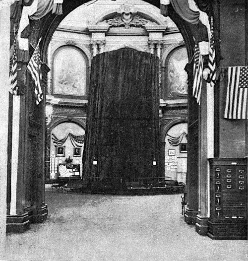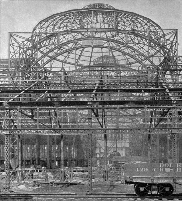 But the great wheel, though out of temper, was not yet without feeling. It swerved aside upon reaching the Woman’s Building, plunged into the Lagoon, where, frightened by the squawking of the swans, it shot madly toward the Government Building. Probably it would have gone entirely through except for the fact that the Department of Justice lay directly in its course. It could not face the stern portraits of judges upon its walls, and, destroying only the big tree and a few other antiquities of slight importance, it encountered the Liberal Arts Building but slightly checked in speed.