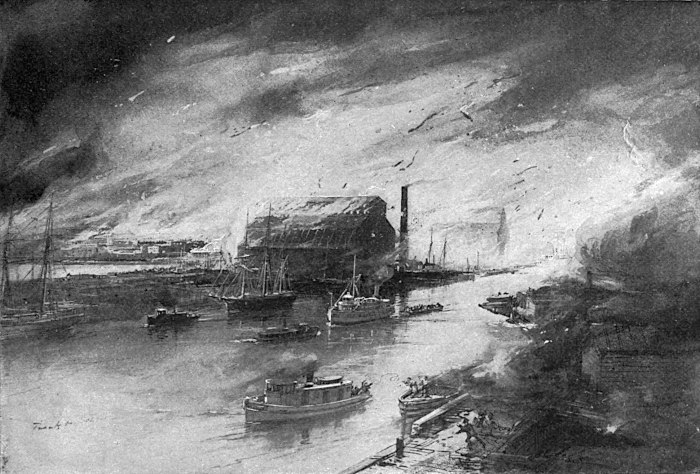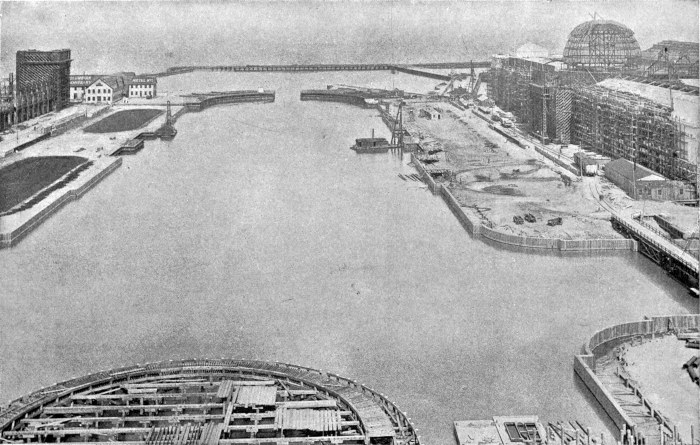 Cutting a clear channel through the biggest building, the wheel leaped the Basin—a sight that so astonished Miss Progress that she called to the Sciences and Arts to save themselves, came down from her perch, fled shrieking into Machinery Hall, and took the Crane for the other end.