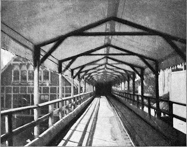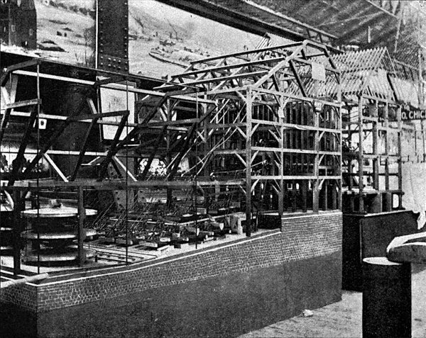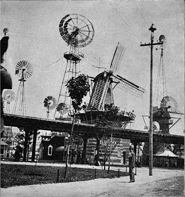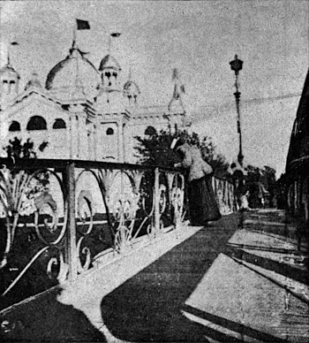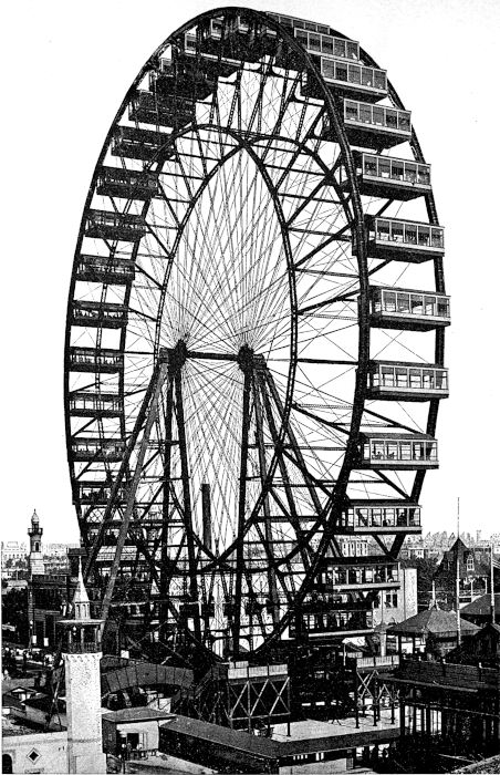 Glancing to the other side of the Plaisance, the Libbey Glass Company was splintered into what one of the Irish dairymaids declared to be “smithereens,” and the monster rolled onward to where the International Dress and Costume Exhibit was situated. Here it broke in one side of the building, and then, catching sight of the contents, with a shriek from every cog fled into the Fair Grounds, cutting its way through the Illinois Central and Intramural bridges, with no more than slight crunches. The bear and Mr. Douglass were still walking their tread-mills, and the Panorama of the Alps still decorated a whole side of the wheel.