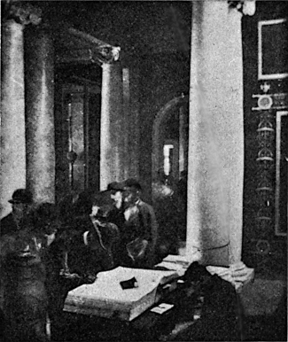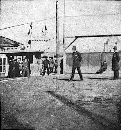 The guard went to a sort of little sentry-box, and sent out a signal. Pretty soon a patrol-wagon came driving up, and we were taken in it outside of the grounds to a police-station.