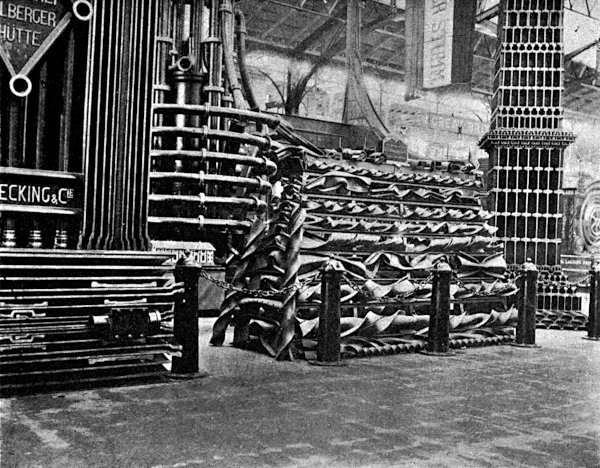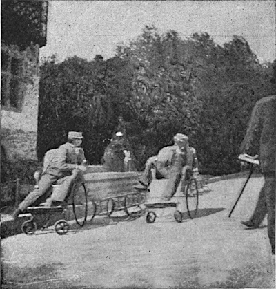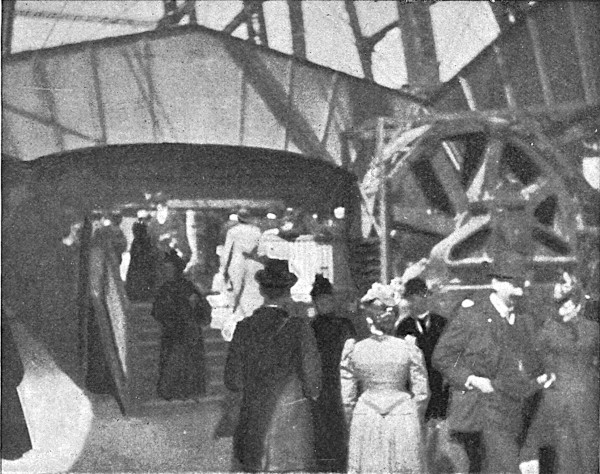 As the great unicycle ran for the Transportation Building, the statue of “Land” remarked, “For the land’s sake!” and hastily put on brakes, a course for which he was commended by Messrs. Fulton and Watt, his neighbors. Stephenson, however, blamed him for not first securing one of the air-brakes, of which there were plenty inside the building.