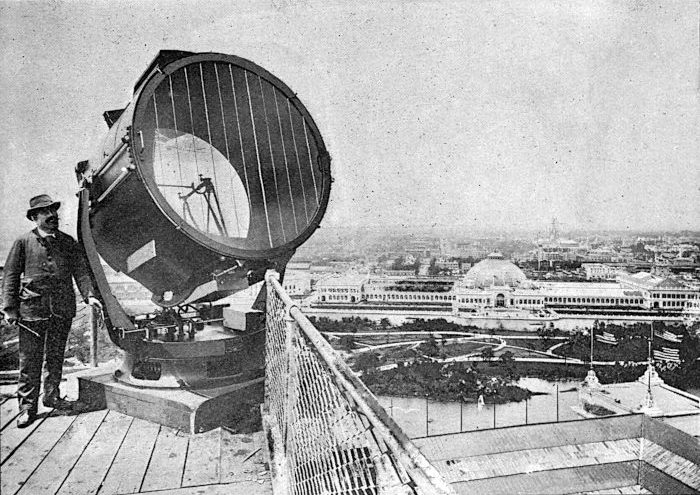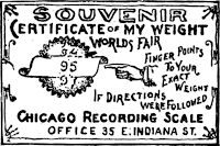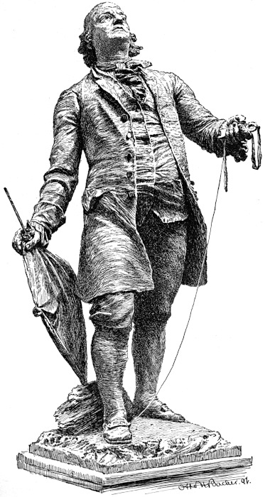 On its way down the center aisle, the wheel picked up the big telescope, and on its next revolution flung that marvelous instrument high in air. But Ben Franklin was waiting for just such a chance, and he promptly accepted it. Chucking aside his key and kite-line, he stepped lightly out from the portico of the Electricity Building and caught the telescope on the fly (for which feat he afterward received a vote of thanks from the University of Chicago), placed it carefully on the Wooded Island, and modestly resumed his place on the pedestal, saying simply, “A penny saved is two pence clear.”