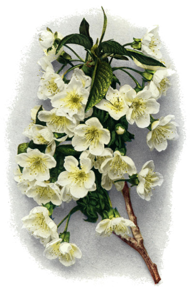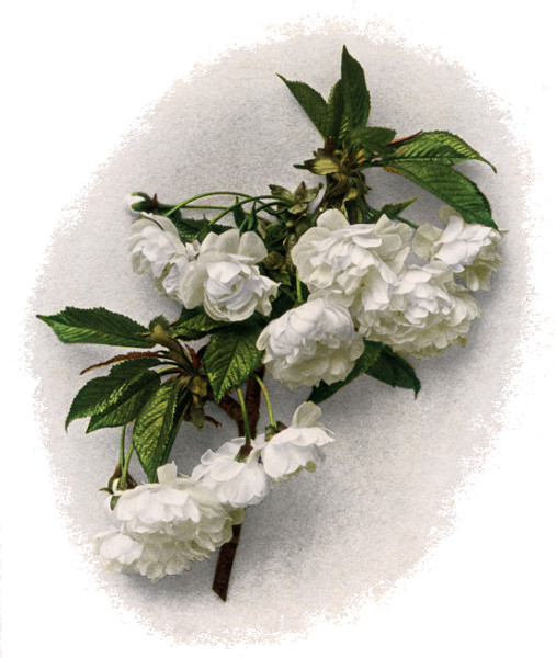 To people who know it only for its fruit, the cherry does not appear particularly desirable as an ornamental. But wild and cultivated cherries furnish many beautiful trees in a genus peculiar for the beauty of its species. The color and abundance of the flowers, fruits and leaves of the cultivated cherries and the fact that they are prolific of forms with double flowers, weeping, fastigiate or other ornamental habits, make the several species of this plant valuable as ornamentals. Besides, they are vigorous and rapid in growth, hardy, easy of culture, comparatively free from pests and adapted to a great diversity of soils and climates. Both the ornamental and the edible cherries are very beautiful in spring when abundantly covered with flowers, which usually open with the unfolding leaves, as well as throughout the summer when overspread with lustrous green foliage and most of them are quite as conspicuously beautiful in the autumn 7 when the leaves turn from green to light and dark tints of red. All will agree that a cherry tree in full fruit is a most beautiful object. In the winter when the leaves have fallen, some of the trees, especially of the ornamental varieties, are very graceful and beautiful, others are often picturesque, and even the somewhat stiff and formal Sweet Cherries are attractive plants in the garden or along the roadside.