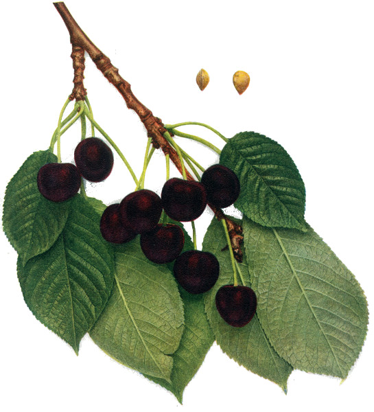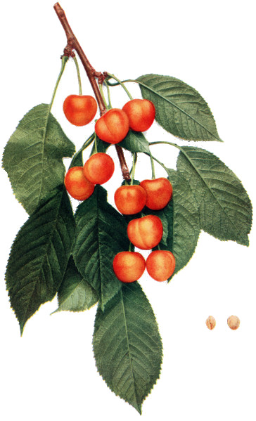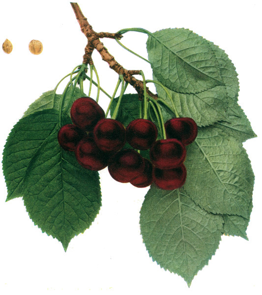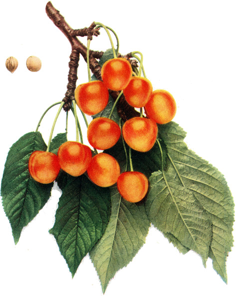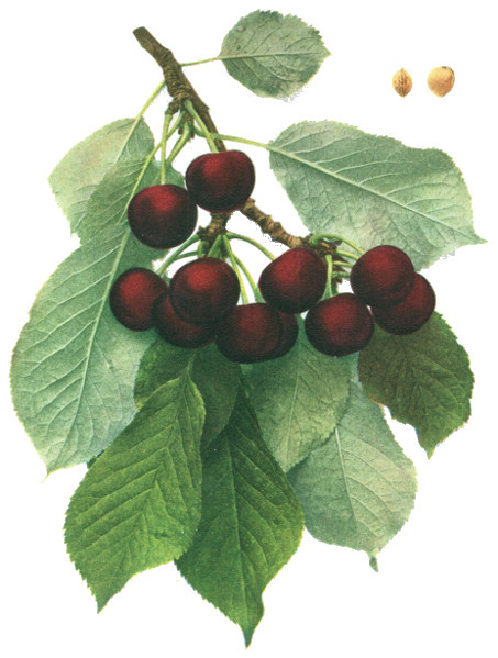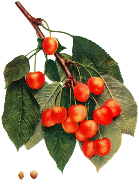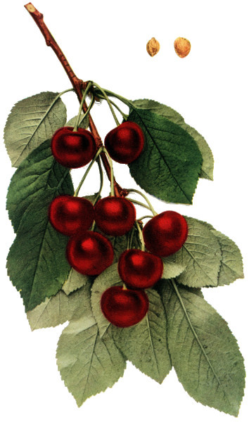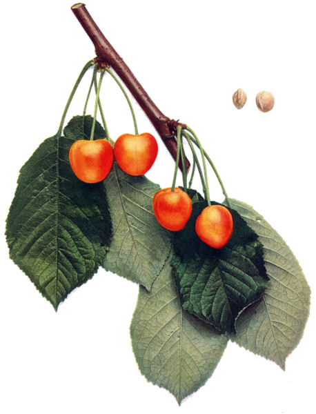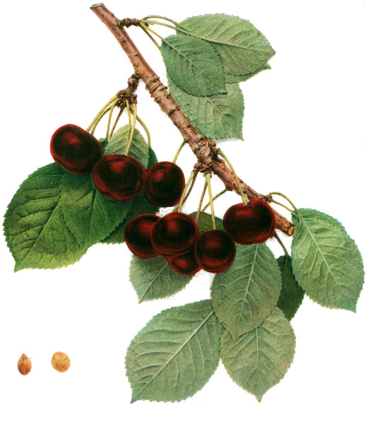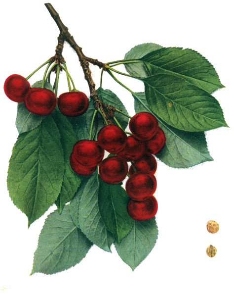 Of all organs, the fruit of the cherry is most responsive to changed conditions and hence most variable, yet the fruits furnish very valuable taxonomic characters in both botany and pomology. In pomology, in particular, the fruits must be closely studied. Size, shape, color, bloom, stem, cavity, apex, suture and skin are the outward characters of which note must be made; while the color, aroma, flavor and texture of the flesh are usually very characteristic. Both species and varieties are well distinguished by the time of ripening though there is much variation in ripening dates. The keeping quality is scarcely taken into account with cherries but varies a great deal, chiefly in accordance with firmness of the flesh. The flesh of cherries, as in all drupaceous fruits, clings to the stone or is wholly or partly free—a character of interest both to the systematist and to the fruit-grower. The color of the juice, whether colorless or red, is a plain and certain dividing line in both species and varieties.
