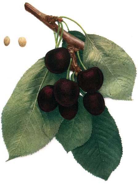 The pits of cherries are rather more lacking in distinction than in other stone-fruits, plums for example, yet they must be accounted of considerable value in determination and for this reason have been included in all of the color-plates of varieties. Cherry-pits from individual trees are almost lacking in differences except in size but between species and varieties show many distinctions not only in size but in shape, surfaces, grooves and ridges, in the ends and more or less in the seeds within. Cherries of any variety grown on poor soils or in incongenial climates tend to have large stones and little flesh, while the pits are smaller and there is more flesh with the opposite extremes in environment. As will be pointed out in the discussion of the group of cherries known as the Dukes, many varieties have pits with shrunken and abortive seeds coming, as we think, from the hybrid origin of these cherries.