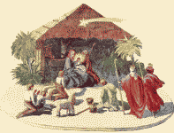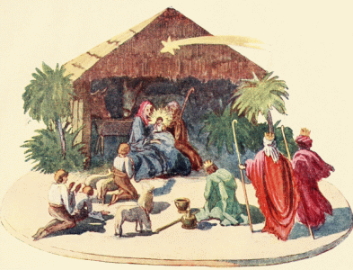 But, most precious of all her possessions, was a little altar carved in ivory. In size, it was no larger than an apple; but it had two little doors, which, opening, showed a little stall, in which sat the Holy Virgin with the Child on her lap and, behind, a yellow ox and a grey donkey looking out across the manger and breathing upon the two. On the left, knelt the shepherds surrounded by their fleecy sheep; and, from the right, came the three kings with golden crowns on their heads and dressed in cloaks of violet, red and green. The black one was smiling and showing his white teeth, as they offered their gifts. All of the figures were just like life! The Virgin had a beautiful face with blue eyes and dark eyebrows, and the Babe was all pink and held in His hands a little golden apple.