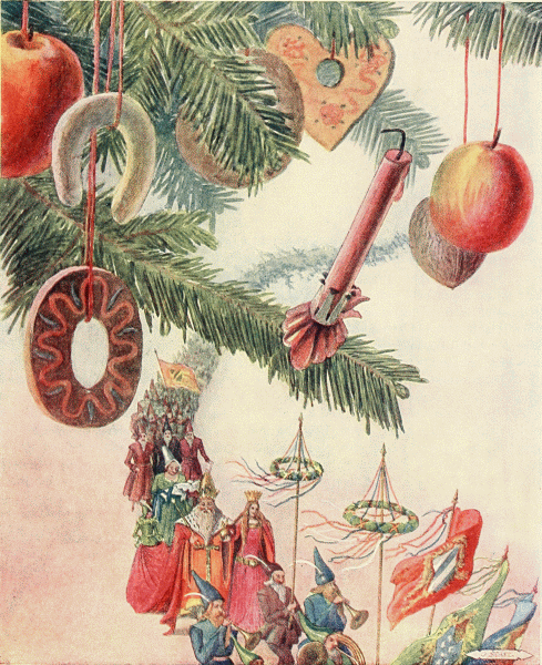 The old lady woke with a start, but the voices seemed to call to her faintly, as if from a great distance. She looked about her, but saw no one. The same faint sound of voices was still to be heard, and, now, right under the tree, she perceived a tiny little man in a red coat, just as if one of the three kings had really come from the altar and wakened her. Not one whit surprised, she bent toward him. It seemed to her that she had always known him.