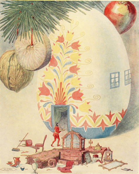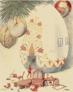 She placed him on the top of the linen press and opened the altar for him; and when he saw the faces of the little figures, Tom became very cheerful, saying that the lady with the Child on her lap was very much like his mother. While Little Tom was looking at the kings, the shepherds and the manger, his Godmother found a nice, large Easter egg that was all hollow and gaily painted in red and yellow. With a pin she pricked out a door on one side, and on the other, two windows; then she set the egg firmly in the earth, under the tree and told him this would be his home and that he should carry some earth inside, and stamp it into a hard, level floor. She wanted to give him something to keep him busy, so that he would not think of the misfortunes that had befallen him.