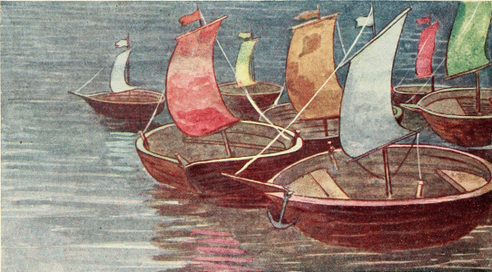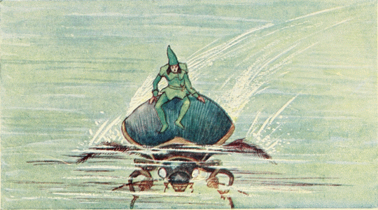 On this stream stood the great navy of the gnomes, made from walnut shells. The entire court entered the ships and started rowing to the east from the underground country; but the stream continued to rise and the over-crowded ships began to rock, until they sank one after the other and all the gnomes were lost. Little Tom knew how to swim very well but he would surely have been drowned, if he had not caught hold of a hazel-nut boat. This was taken up by a little current and swept through the hole by the hearth into the Godmother's large room.