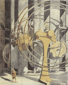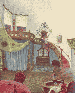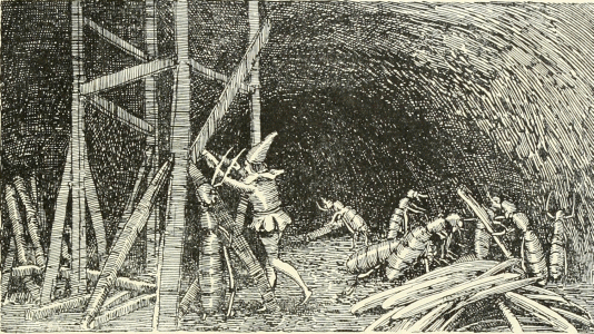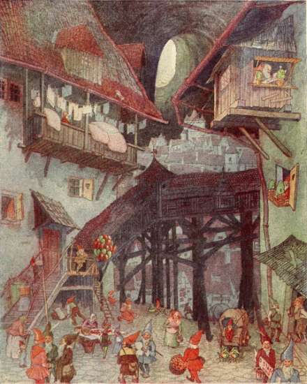All the gnomes were quietly sleeping, utterly unconscious of any danger, when, all of a sudden, great waters came from under the well, flooded the entire town, tore down the walls and rose to the upper floors. His mother woke Little Tom and ran with him to the upper corridor, through which was already running the stream which was their main river.