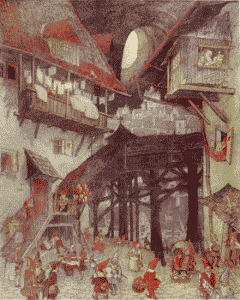 The little man scrambled up to the edge of the old book which still lay upon the press, bowed, stroked his black beard, and spoke: »Honored lady, my people send me to ask of you, in the name of our king, a favor. A prince has been born to us and we should like to celebrate his christening here before this little altar, which is most precious to us. Our kingdom lies in the corridors under the old castle and extends to the well by the little chapel, and even to your hut. Our forefathers were true servants of your ancestors, the knights of the castle, and guarded for them their treasure. In this little altar are pictured the faces of our former kings.«