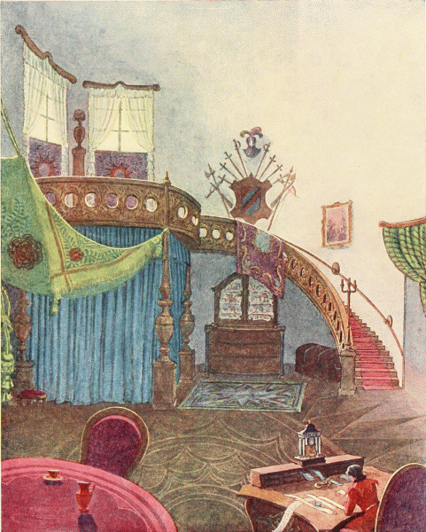 All day long, the herb woman had much to do in caring for her house, fetching and drying her herbs and brewing her medicines. From one week's end to the other, she was never idle. But, on Sunday afternoons, when her work was done, she would take the little altar and place it on the press between the windows. Sitting down before it in a comfortable leather armchair, she would read to herself from a very old book, ornamented with hammered brass and with colored stones set in the covers. Her book told all about the patient Griselda, the siege of Troy, about Siegfried, Brunswick, Blanik, and many other brave heroes. Around the first letter of each story, were painted knights, princesses, men-at-arms, magic castles, and scenes from strange, oversea countries.