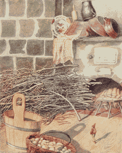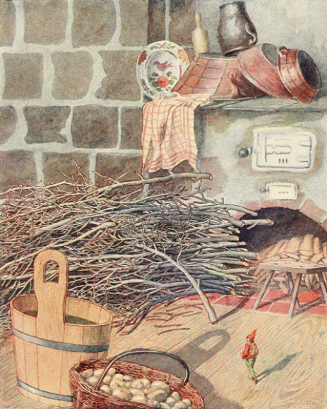 In the morning she milked Speckle and, as she drank the good, warm milk, she laughed to herself over her dream. But it would not leave her mind and, presently, she went to the hearth to see whence the procession of gnomes had come. She found nothing but a hole in the floor, large enough for a cat to pass through; but she thought to herself, »Why should I not go to the well by the chapel?«
