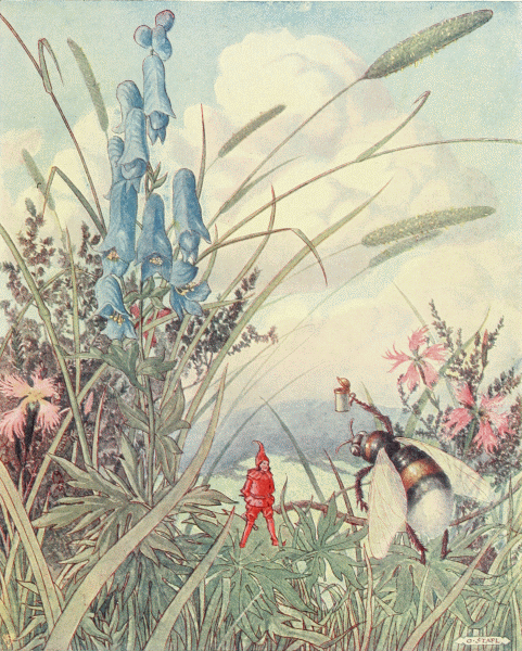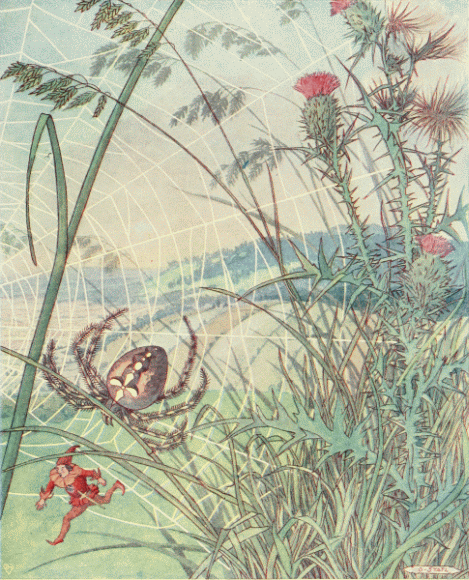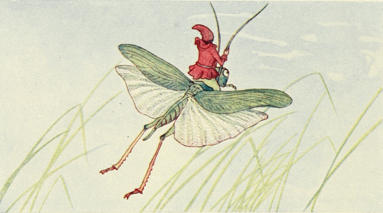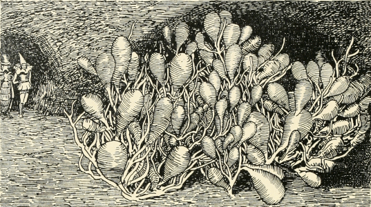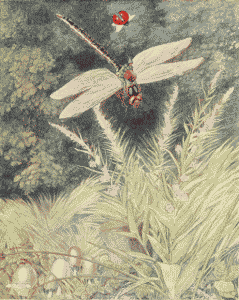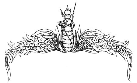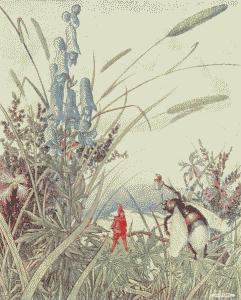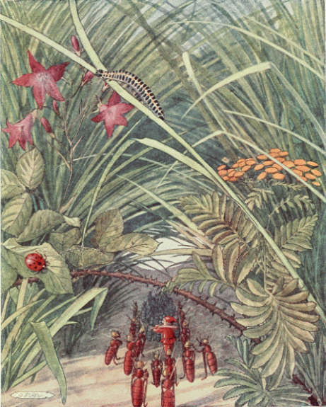 First, came the pipers and the band of musicians, playing on strange, curved trumpets and beating drums that sounded like the hum of many flying insects. Behind them walked the old king and the young queen in long robes of spotted butterfly wings and wearing golden crowns that glistened with precious stones; then the nurse, bearing a little baby upon a cushion of silver cobweb, tied with a hair of gold. Following them were many dignitaries in gorgeous cloaks and, last of all, came men and women of the people, hurrying across the floor like little insects, for they were hardly any larger.