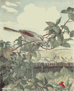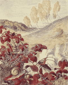 Finally, the snow began to melt, the sun became warmer, the fields lost their coat of white, the meadows became green, and spring had come. When Easter arrived, she had already planted her garden and stripped the roses of their winter coverings. The snow drops and gillyflowers were blossoming by the brook; the cowslips were poking their yellow caps out of their beds, and over the fields the larks sang joyously.
