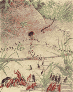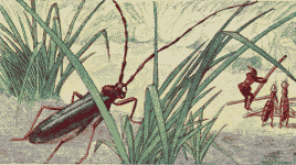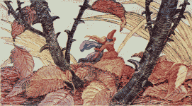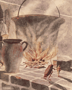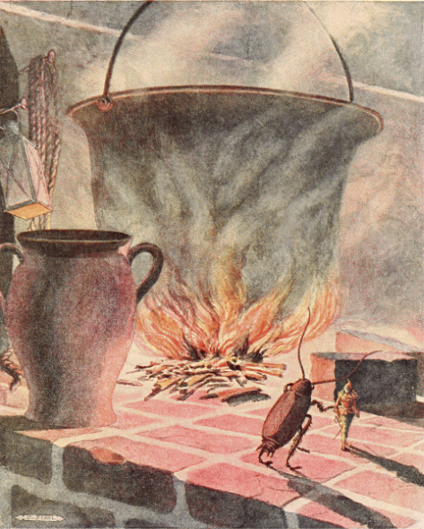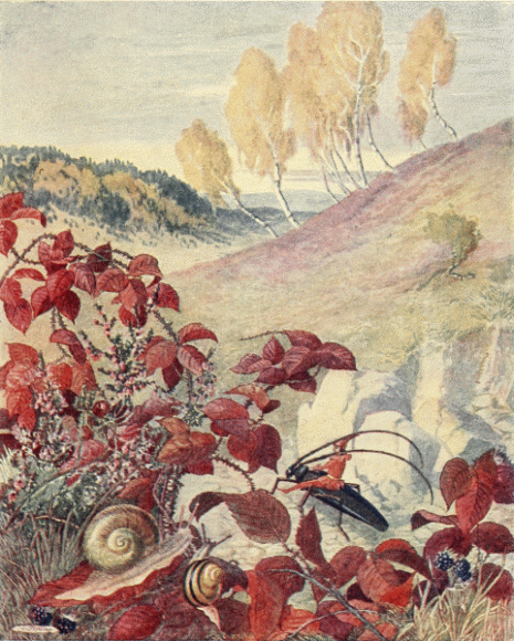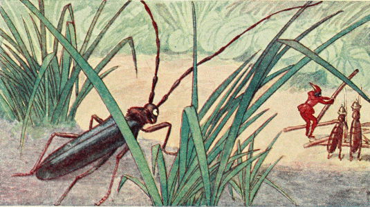Tom walked with Chrysomela along the edge of the stubble field, down the road; that was all they knew of their direction—that they must always be going down. They expected that the way would not be long, for they remembered that, in one day, the ants had brought all their possessions from the Godmother's house to the wood. They forgot that the ants knew the direction and therefore walked straight over everything, while they, not knowing where to go, had to travel the path of the humans and therefore traveled in a wide circle.