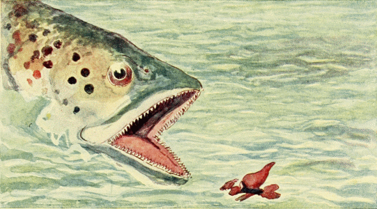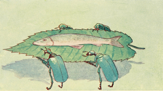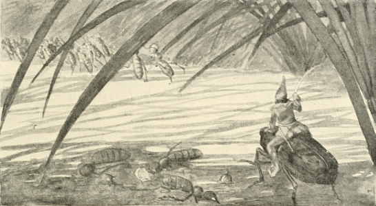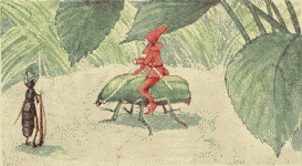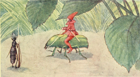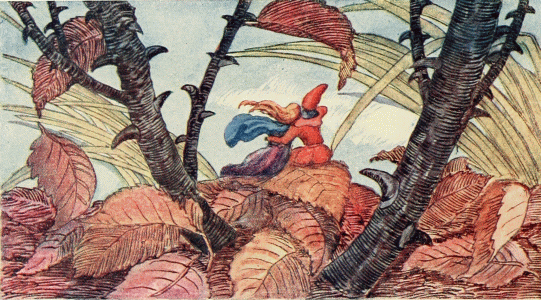 The sun shone through the clouds, brightening the dry stumps, while the cold wind whirled showers of leaves and yellow beech nut shells over the dark water. The Wood-bug was waiting for them, so at once they sat down on his back and started to ride through the forest.
