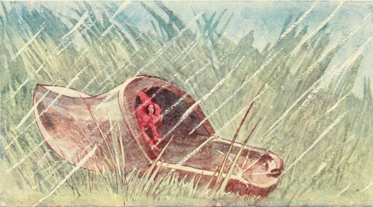 The herb woman took her broom and swept out some of the water and with a cloth mopped up the little pools. Near the hearth the water was quite deep and swirling around and running away through the hole behind. On the water swam a tiny barge formed from a hazel nut, and in this boat was a very small lad indeed, rowing with his oars of straw and working with all his might, so that the whirlpool should not carry him back into the hole.[Pg 21]