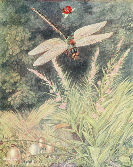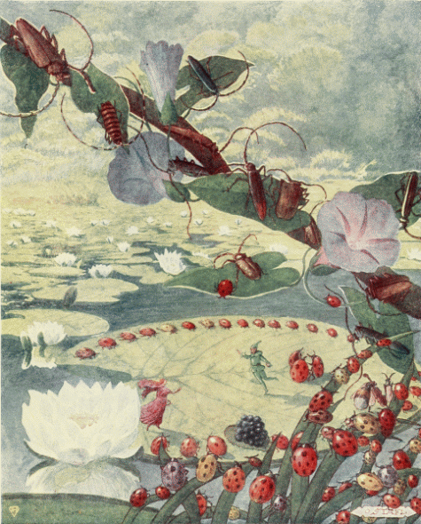 They tried to explain to him that they did not sleep during the winter. Now it was the Wood-bug's turn to be puzzled. Tom did not know what winter was, but when he saw that the whole Ladybird kingdom had disappeared and that all the creatures were preparing for a long sleep, he felt that they must surely perish in the lonely wood. Nothing was left to do, but to seek his Godmother and take Chrysomela to her, asking her to forgive them and allow them to stay with her during the winter.